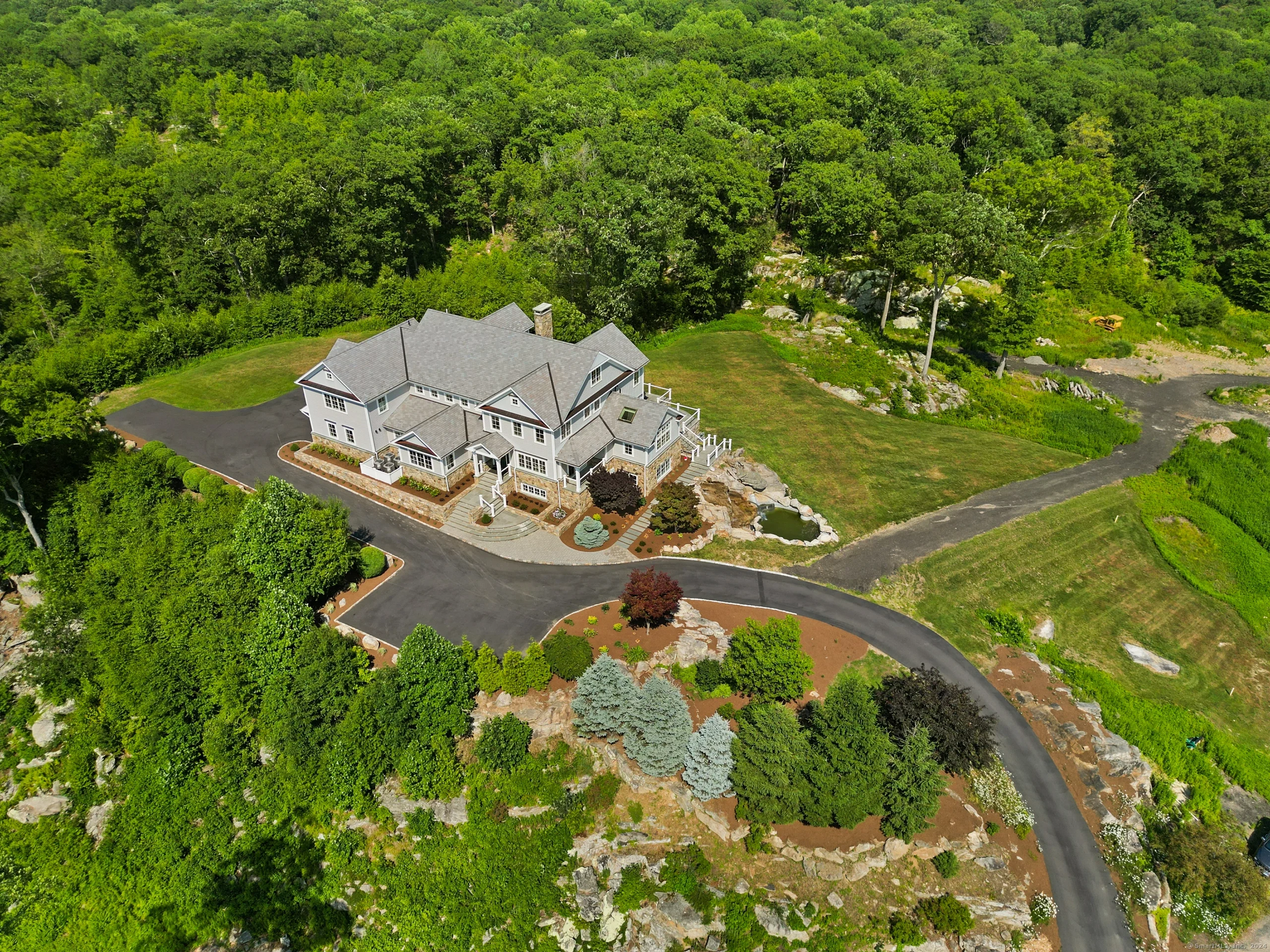 This exquisite custom estate with pool site on 4.7+/- acres (poss./potential to divide) will take your breath away. Set atop one of the highest points in the area, this luxurious retreat blends modern luxury, convenience, privacy and treetop vistas into one irresistible package. Sited to capture the incomparable views, every room and multiple terraces have gorgeous panoramas, with a circulating waterfall to set the stage for the tranquility that awaits upon arrival. A seemingly endless list of amenities speak to a home that was constructed with no expense spared, everything from an elevator, natural gas utilities, 6 BRs with choice of main or upper level primary suites, incredible craftsmanship and highest-end materials. The stunning Great Room is at the heart of the home, with an impressive stone fpl, French doors to the terrace, adjacent wet bar/butler's pantry, incredible dining rm w/coffered ceil. The gourmet kitchen is a stunning showplace of sophisticated design and unparalleled quality w/ Sub Zero & wolf appls, marble counters, cathedral ceiling, skylights & three exposures capturing views. Two private offices for ultimate productivity. Each BR is accompanied by a luxe bath & fitted closets of outstanding quality. The finished, walk-out LL has an array of flex spaces and is an ideal future cabana for the pool site, or multi-generational suite w/full kitchen, fpl, BR, full bth, space for sauna & much more. 2 laundry rms, 3 car garage. Addl. space avail on 3rd flr.
