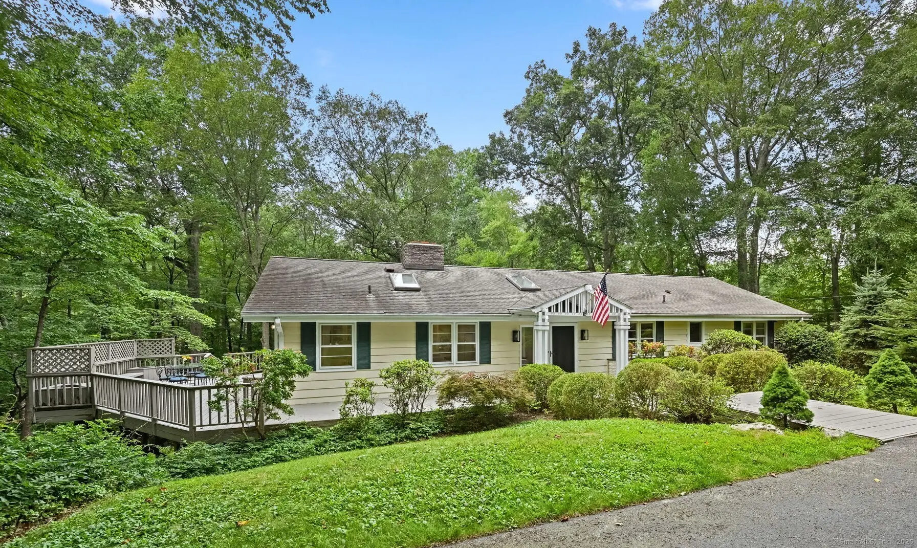 Enjoy a serene country retreat in this airy, light-filled Ranch nestled in the sought-after Saw Mill Association. Set on over an acre with a peaceful, natural setting, this open-concept home offers sweeping views of the River and lush yard. A skylit foyer welcomes you into a spacious living and dining area with a masonry fireplace and oversized windows that frame stunning river views. The bright eat-in kitchen features a skylight, center island, and sliders to a side deck-ideal for casual dining or entertaining. The bedroom wing includes a generously sized primary suite with two walk-in closets and a full bath with a walk-in shower, plus two additional bedrooms-all with gleaming hardwood floors. A full hall bath completes the main level. The walk-out lower level includes a large family room with a painted brick fireplace, dry bar with wine cooler, sliders to the back deck, a guest bedroom, full bath, and a bonus room with built-ins-ideal for an office, gym, or playroom. Access to the 2-car garage and a mechanical/laundry room adds convenience. Enjoy outdoor living on the expansive multi-tiered wraparound deck with panoramic views of nature. Refinished hardwood floors, freshly painted interior. The Saw Mill Association offers year-round activities and access to a private 164-acre nature preserve-just minutes to Merritt Parkway, downtown, shopping, and Harbor Point!