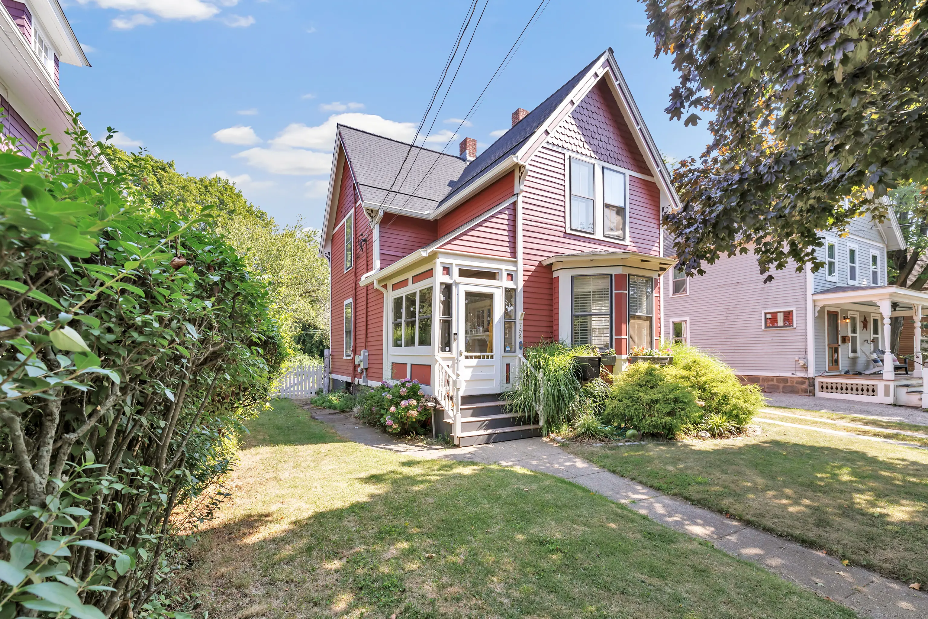 Nestled in Stratford's sought-after historic district, this beautifully maintained Victorian-style home offers the perfect combination of timeless character and thoughtful updates. The inviting exterior, with its striking red clapboard siding and welcoming front porch, sets the tone for what awaits inside. Step through the front door into a light-filled interior featuring warm hardwood floors, tall ceilings, and period details throughout. The updated kitchen is a chef's delight, showcasing butcher block counters, a farmhouse sink, stainless steel appliances, open shelving, and bold cabinetry that adds a pop of personality. The renovated bathroom blends classic and contemporary design with a walk-in shower accented by rich green tile, exposed brick, and a custom vanity with marble countertop. Upstairs, you'll find comfortable bedrooms with plenty of natural light. Outside, enjoy a large, fully usable yard with mature plantings, a charming garden shed, and a spacious deck perfect for outdoor entertaining or quiet relaxation. This home offers the rare combination of old-world craftsmanship and modern convenience, all within close proximity to Stratford's beaches, restaurants, shopping, and Metro-North station for an easy commute to New York City.