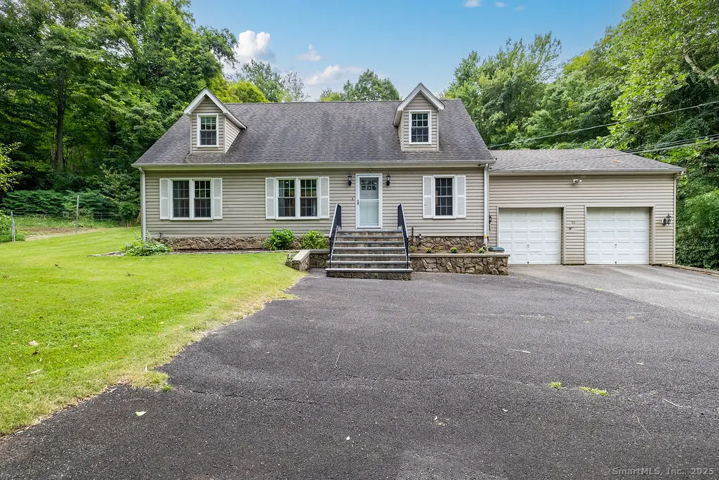 Quintessential New England Cape nestled on an incredibly private 3 acre lot.This custom-built home offers a flexible floor plan that offers 4 bedrooms, 2.1 baths and an over-sized 2 car garage. But it's really all about the spectacular lot with its rolling, lush lawns and the fact that it feels like your very own PRIVATE oasis. Hard to believe that it's just a mile to the Village Green and vibrant town center. There's plenty of room for a pool in the back yard and the home sits deep on the lot and far from the road at the end of a meandering driveway. Gorgeous hardwood floors grace the home's interior and all the windows were recently replaced. The main floor features a living/dining area that opens on to a massive, low maintenance deck.The kitchen has gleaming granite counters and a floor to ceiling pantry. The primary bedroom suite is located on the main floor and has a walk-in-closet and plenty of space for a king sized bed.Its bathroom features a large double vanity topped with granite and much storage. There is a half bath and an additional bedroom on the main floor however, the homeowners are currently using it as a formal dining room.The second floor has 2 dormered bedrooms, another full bathroom plus a bonus space - currently used for storage but would make a great reading area, play room or home office space. The large basement is partially finished and has access to the yard. A spacious laundry room and utility space complete the lower level and offer add'l storage.