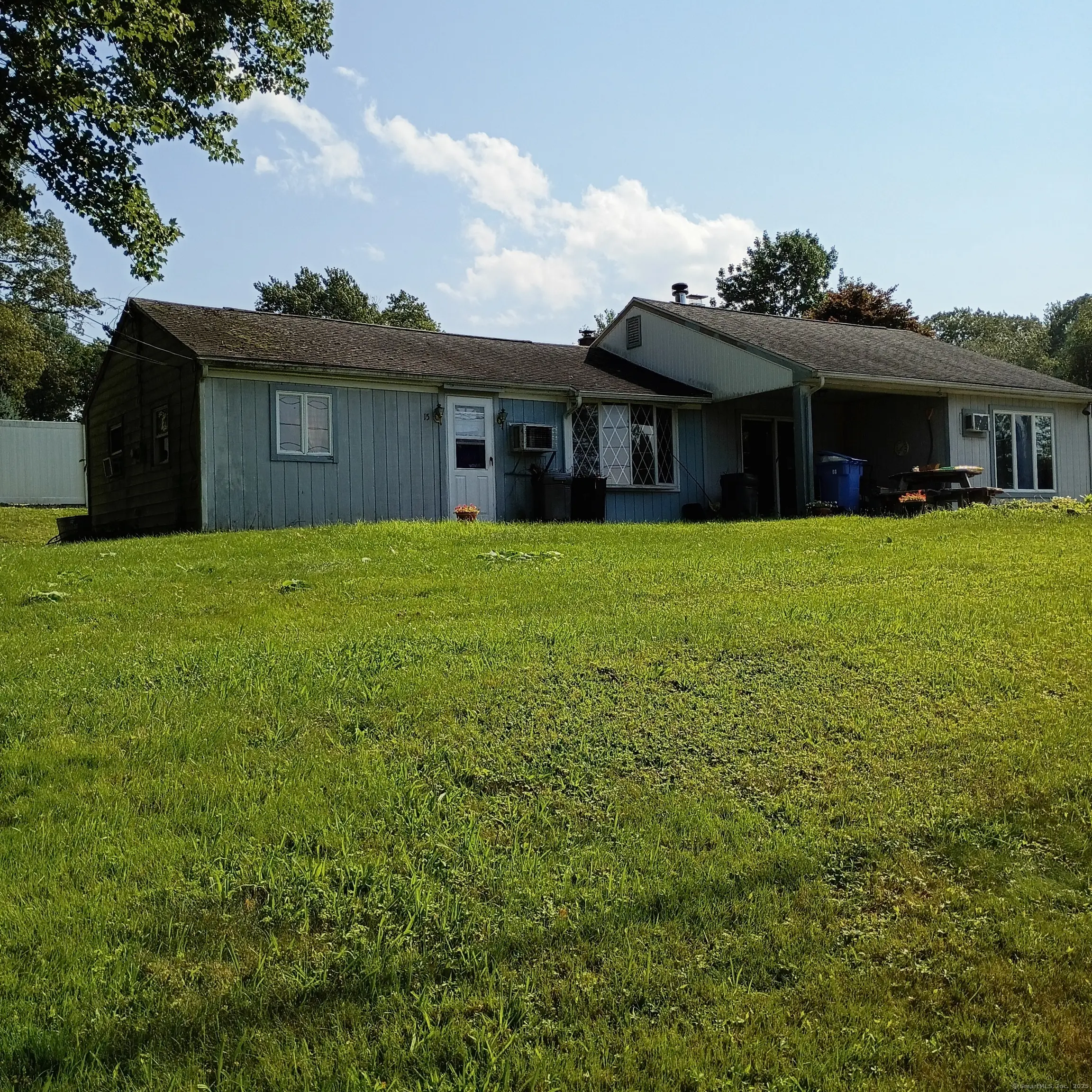 This is a lovely ranch home with 3 bedrooms, and living room, kitchen, and dining area open and spacious with a breakfast bar island. The large bay window has triangular glass panes and wood beams on the ceiling which are reminiscent of an English cottage. There is a wood stove that adds a cozy touch. This home rests on a spacious elevated, lot with beautiful views of a lake from a front covered patio. The private backyard is great for gatherings, or just relaxing. There is a back door for easy access to the back yard, and includes 2 storage sheds. The interior has been recently painted.