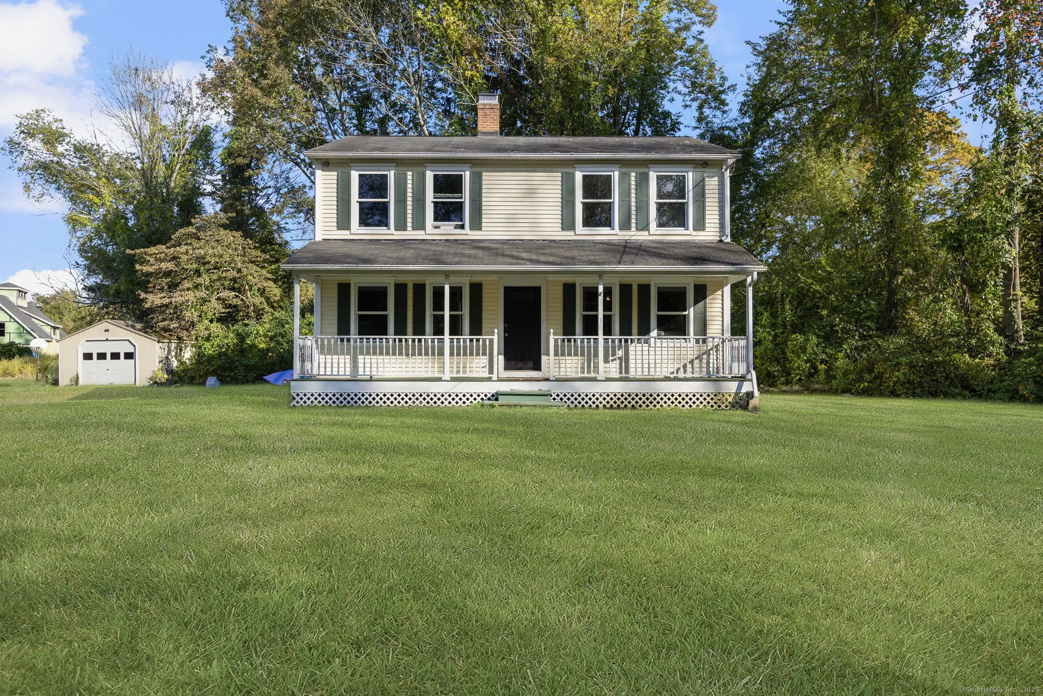 Charming 3-bedroom, 2.5-bath Colonial set on a picturesque 1-acre level lot bordered by a stone wall. Conveniently located near Routes 44 and 97, with restaurants and amenities in Pomfret Center and Putnam just minutes away. The main level offers a kitchen with tile floors and a walk-in pantry, a dining room, and a large light-filled living room, both with hardwood floors. A first-floor office provides flexibility for work or study, and a half bath completes this level. Upstairs, the primary suite includes two closets (one a walk-in) and a private bath with tub & shower. Two additional carpeted bedrooms and a full bath round out the second floor. The basement adds extra living space with a family room, laundry area featuring laminate flooring and built-ins, and a separate utility room with storage shelves. A detached one-car garage provides added convenience with built in's and removable shelving. With its country charm and spacious layout, this property is ready for a buyer to bring their finishing touches and make it their own!