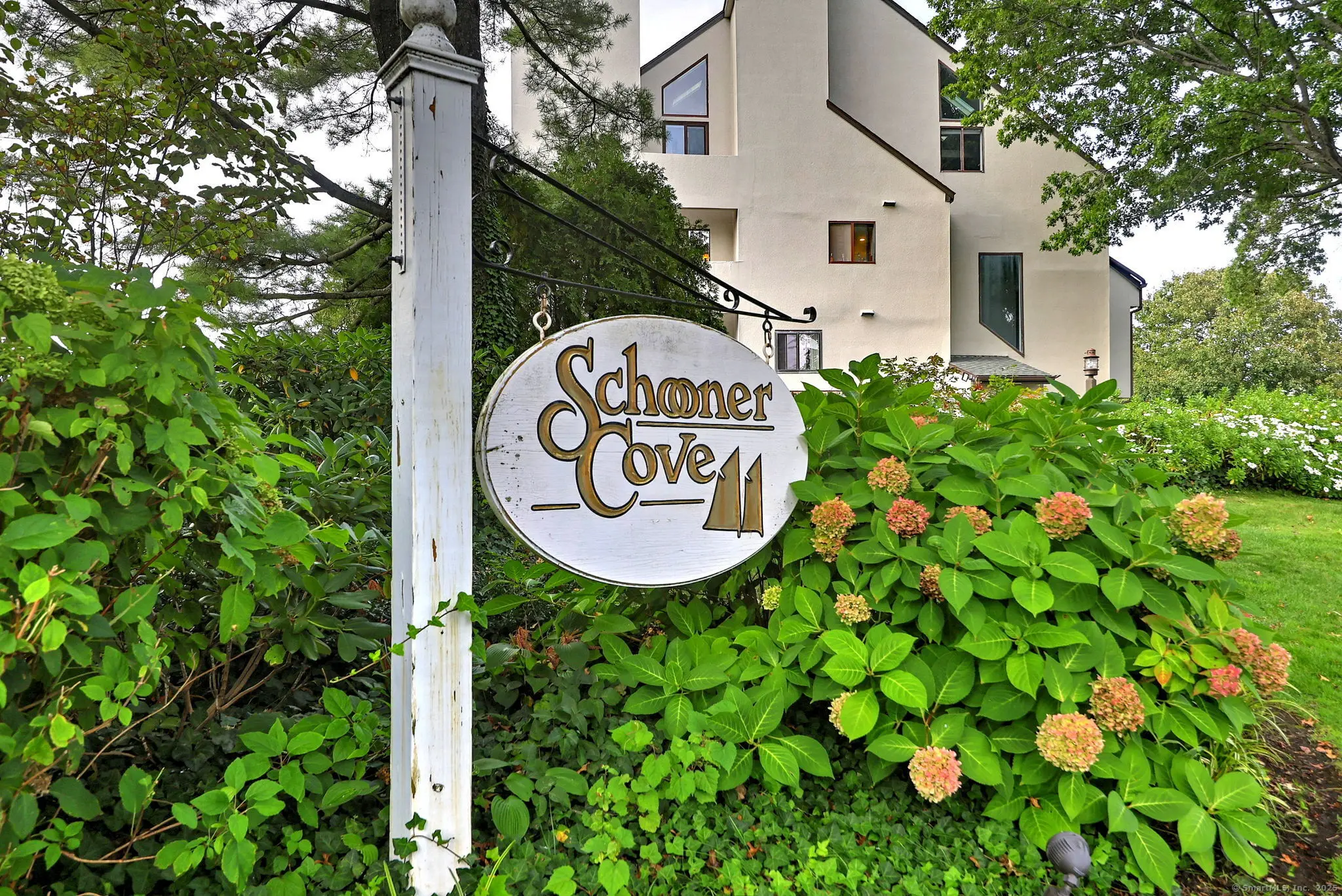 Welcome to Schooner Cove, a beautifully landscaped waterfront community with a private marina in the Shippan area of Stamford. This classy ground-floor unit with gorgeous LVT floors throughout has been tastefully and stylishly updated. The kitchen showcases stainless steel appliances, under cabinet lighting and quartz countertops, and flows effortlessly into the dining area and spacious living room. The living area, with a cozy wood-burning fireplace and ceiling to floor windows is an inviting place for relaxing and entertaining. A dry bar and automated window shades are a wonderful addition to this space. A slider door from here to a private patio is also a wonderful spot for morning coffee or head out and stroll over to your very own boat dock (#A11, for a 26ft boat). The main level boasts a generous sized bedroom with a private and renovated ensuite bath, along with a convenient half bath and laundry facilities. Upstairs, there is an additional bedroom with another ensuite bathroom. Residents of Schooner Cove can also enjoy a gated swimming pool with toilets and picnic tables. With heat, water, snow removal and landscaping covered by the association, you'll enjoy a hassle-free waterfront living experience. It's a short walk from here to restaurants, bars, public beaches, sporting fields, and beautiful parks and minutes to Stamford train station and I95. What more could you need or want? Move right in!