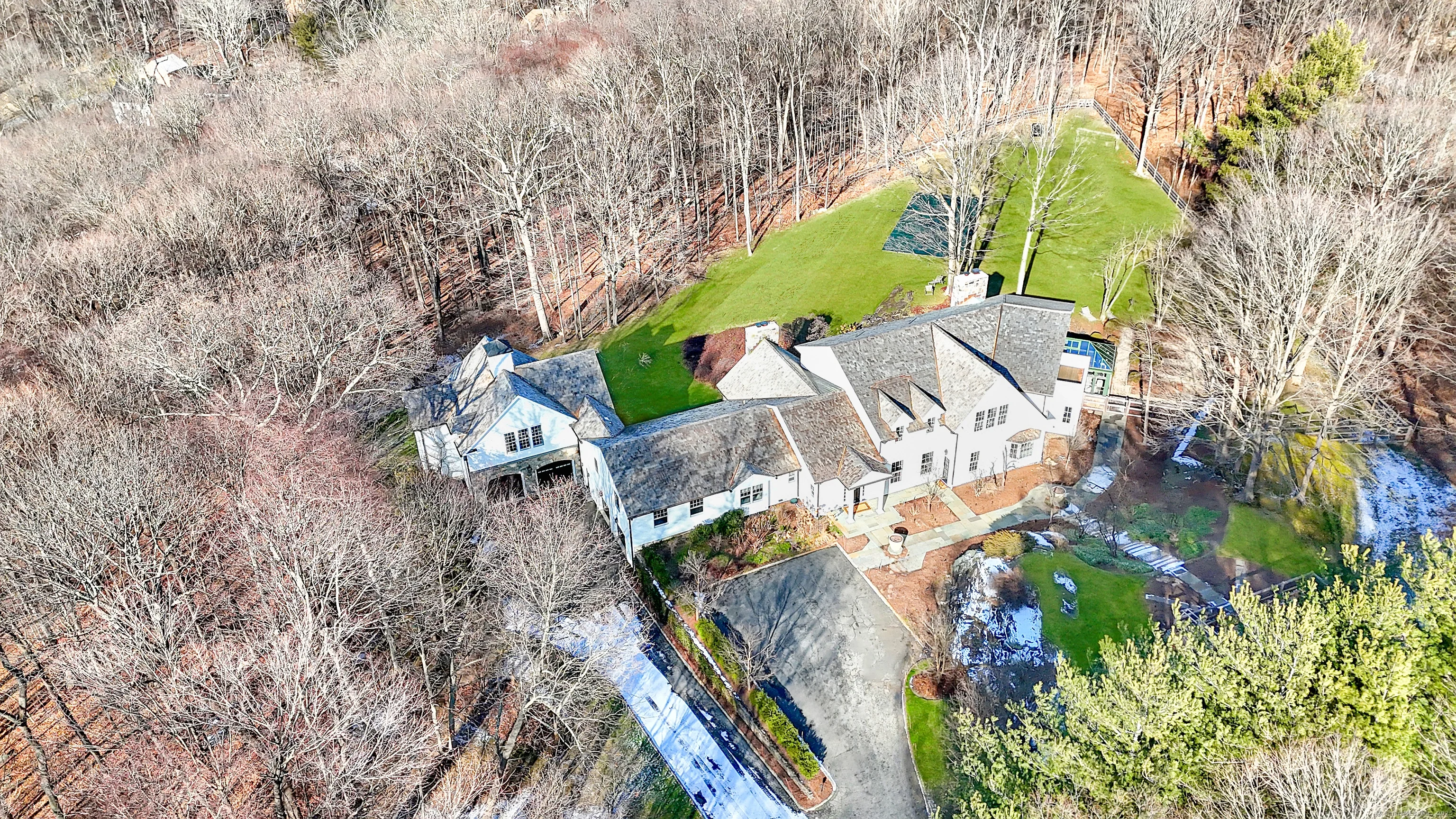 Nestled in scenic Greenwich, Connecticut, just off prestigious Round Hill Road, this extraordinary 6 bedroom, 6.1 bath residence is a serene retreat that epitomizes sophistication and privacy. Come spring, the property transforms into a lush canvas of vibrant greenery, adorned with blooming flowers and carefully curated specimen plantings. Set on 4 verdant, ultra-private acres of impeccably manicured grounds, custom commissioned garden with irrigation, complete with flower gardens, riding trails, and a newly installed Group Works Water Concepts pool, this family compound offers an unparalleled blend of elegance and tranquility. The home's interiors are as stunning as its outdoor spaces. Attached guest suite with separate entrance provides an ideal space for visitors or extended stays.